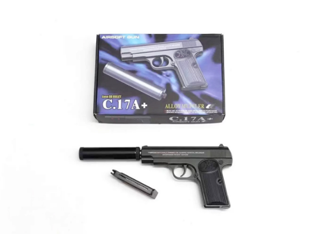 Пистолет пневматика арт. C9+ Металл с глушителем 1шт. в кор._~Пистолет стреляет пластиковыми пульками- 6 мм. Глушитель в комплекте.