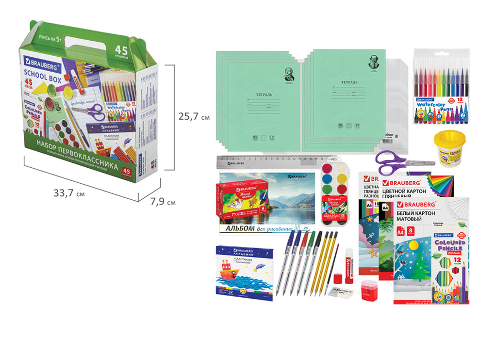 Набор канцелярских принадлежностей BRAUBERG "УНИВЕРСАЛЬНЫЙ" для выпускников детского сада и учеников начальной школы в красочной упаковке. Скомплектован на основе рекомендаций учителей.