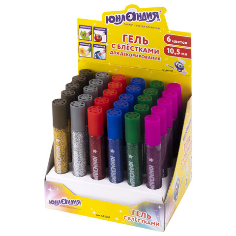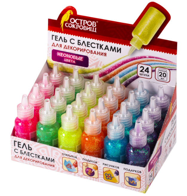 кс_Гель с блестками арт. 662261 ОСТРОВ СОКРОВИЩ, 20 мл, неон, цв. ассорти, в дисплееВ дисплее содержится 24 тубы геля с блёстками объёмом 20 мл, представлены в 6 различных цветах: голубой, фиолетовый, розовый, оранжевый, жёлтый, зелёный.