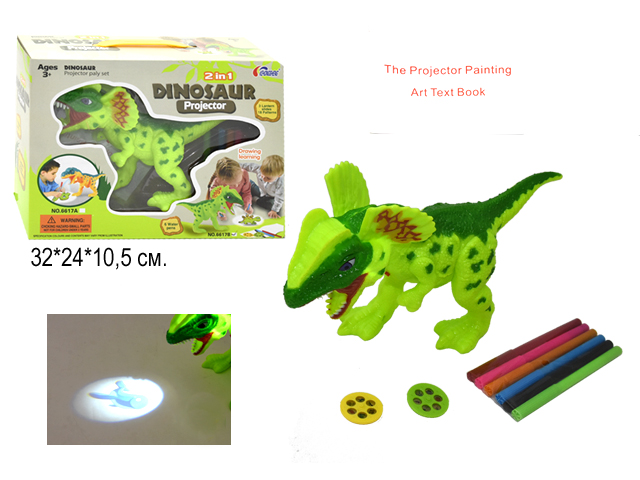 Проектор арт. 6617B Динозавр для рисования на бат., свет, в кор.~/24шт./Как использовать? Динозавр — это проектор-лампа. Чтобы начать с ней работу, необходимо установить один из двух слайдов. Прибор перенесёт изображение на лист бумаги, а малыш с удовольствием обведет и раскрасит полученную картинку. Помимо рисования, с фигуркой можно играть как с обычной игрушкой.
