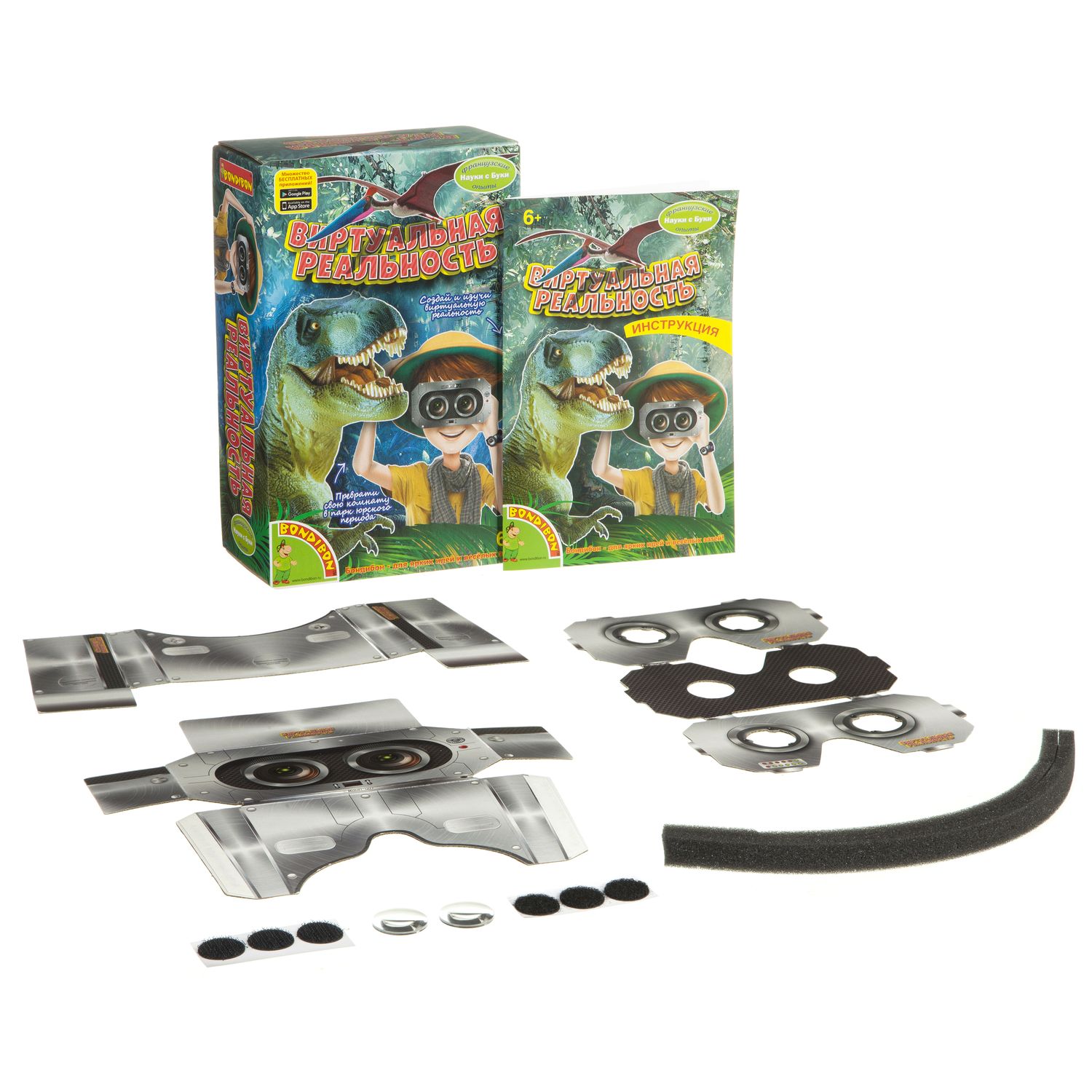 Французские опыты Науки с Буки Bondibon, Виртуальная реальность, арт. WS/938В состав набора входят картонная заготовка, поролоновая заготовка для дополнительного комфорта, 2 х 25 мм в диаметре, 45 мм специальные линзы, 2 большие прямоугольные липучки 2 х 4 мм, 2 маленькие квадратные липучки 2 х 2 мм, инструкция.