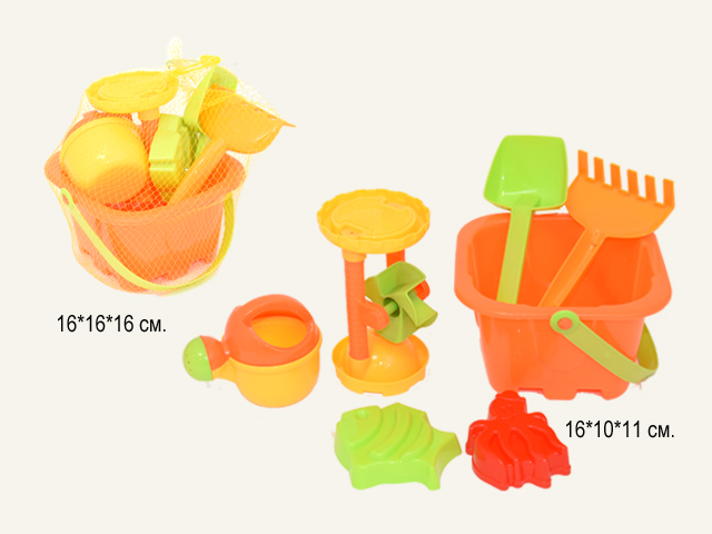 Песочный набор арт. 2029-802 Ведро, лопата, лейка, формочки в сетке
