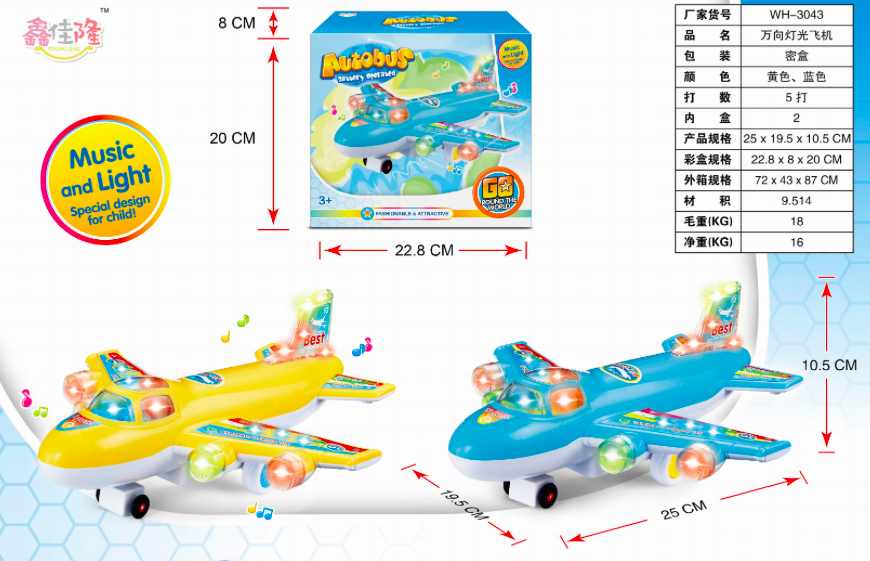 Яркий самолет на батарейках с яркой подсветкой и веселой музыкой понравится малышу.