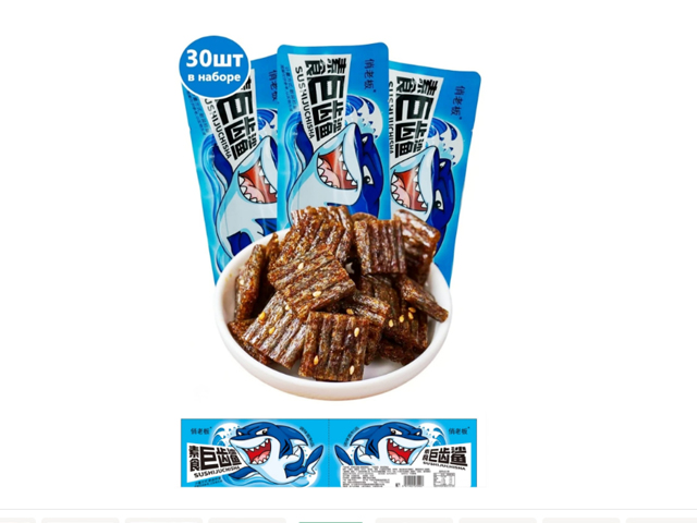 Соевое мясо арт. 070907 Пшеничные пряные ломтики со вкусом рыбы 26 г 30 шт. упаковка с акулой';#,